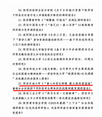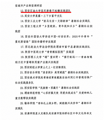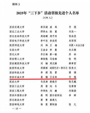 近日,共青团陕西省委、中共陕西省委教育工委在全省范围内组织开展的2025年陕西省大学生暑期文化科技卫生“三下乡”社会实践活动评选表彰结果揭晓,我校电子工程学院坚定禁毒不松懈实践团队被评为省级标兵团队,石油工程学院铁人足迹探寻与文化赓续实践团、机械工程学院四载坚守基层情怀,共筑退伍军人新生路—西安石油大学连续4年开展基层退伍士兵调研与帮扶社会实践活动团被评为省级优秀团队,姜楠、王业林、付强被评为省级先进个人,马克思主义学院《童心向党忆峥嵘薪火相传爱国情暑假社会实践团不同阶段学生群体的抗战精神教育调研报告》被评为省级优秀调研报告,并获团省委专项资助。