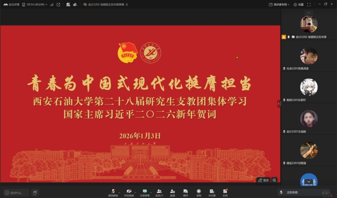 为深入学习贯彻习近平新时代中国特色社会主义思想,加强我校青年学子的家国情怀与担当意识,学校第28届研究生支教团全体成员于1月3日19:00线上集体学习了习近平主席二〇二六年新年贺词,会议由我校第二十八届研究生支教团队长徐顾铭主持。