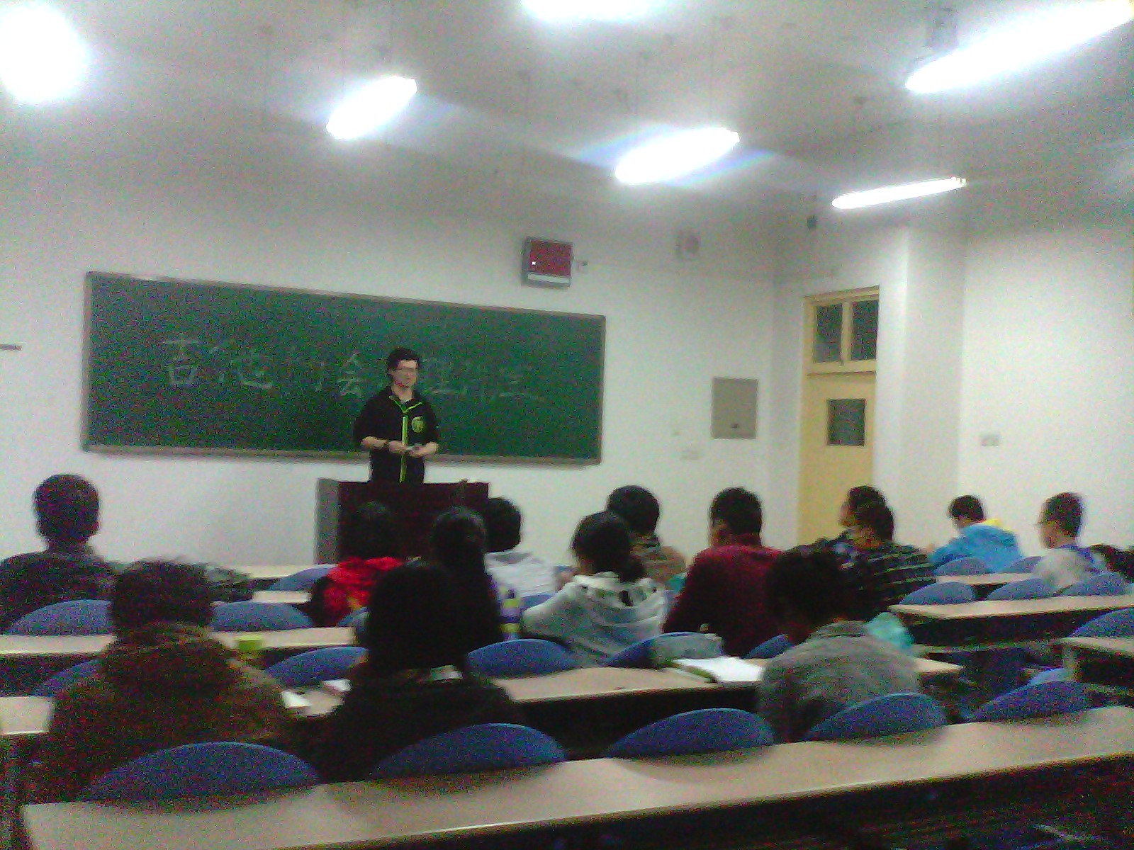 2013年4月19日,吉他协会在A411教室如期进行了吉他讲座,主讲人是吉他协会会长冯林杰。本次讲座内容是关于乐理的一些知识,涉及到音符,吉他谱等常识。此次讲座中冯会长生动风趣而又专业的讲述,深得会员们的喜爱和赞扬。在讲座中,冯会长还不忘经常与会员们进行互动交流。使会员们对此次讲座有了更深刻得理解和贯通。本次讲座是应会员们的要求及在平常活动中会员们所反应得问题而进行的,其目的就在于解决会员们关于音乐的困惑和普及下吉他方面得知识,让会员们学到更多!