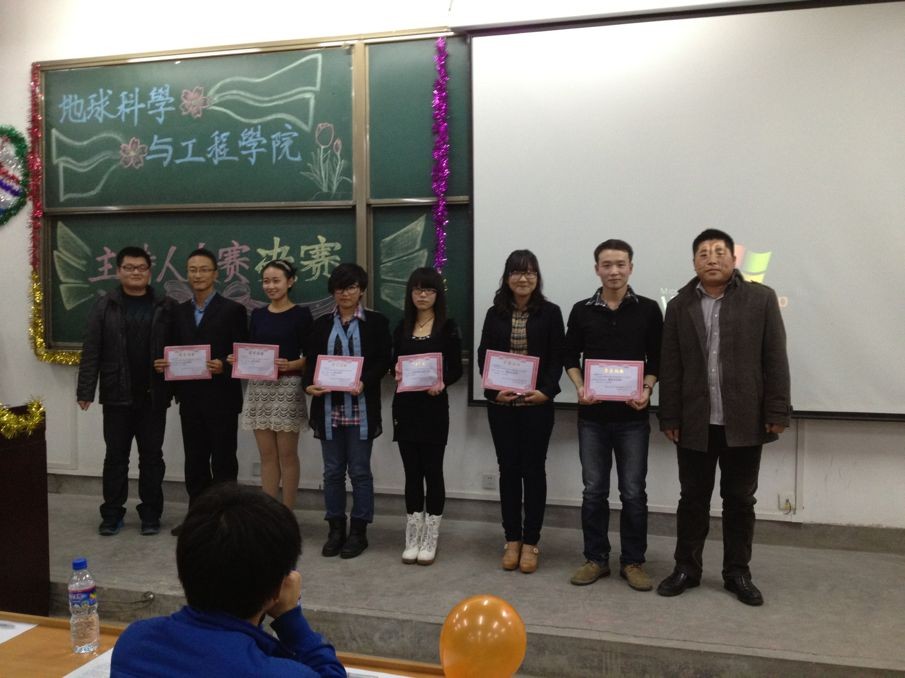 2012年11月12日晚19点30分,地球科学与工程学院于B区212教室举行了地球科学与工程学院主持人大赛决赛。石油工程学院2011级辅导员朱战威老师、我院2011级辅导员邱岭及我院团委学生会主要学生干部作为评委参加了本次比赛。比赛在观众们热烈的掌声中拉开大幕,首先进行的环节为闪亮登场,选手们以自己最新颖的方式向评委及观众们介绍了自己。紧接着最吸引大家眼球的模拟主持环节开始,九位风格迥异的选手为观众及评委带来了精彩的节目主持,而紧随其后的才艺展示,更是将全场的气氛烘向高潮,新疆舞、街舞、诗朗诵、二胡等才艺,无不展示出地学院学生多才多艺的一面。最有一个环节是配对主持,选手们发挥稳定。最后,邱老师总结本次活动,他提到本次主持人大赛办的很成功,学生会在活动组织上合理有序,选手们都表现出了优秀的个人素质和充足的准备;并强调同学们要多参与集体活动,同时加强自己的学习,使得同学们在知识和能力上都能有长足的进步。本次活动很好的锻炼了同学们沟通与临场的应变能力,为同学们今后的学习生活与人际交往积累了宝贵的经验。