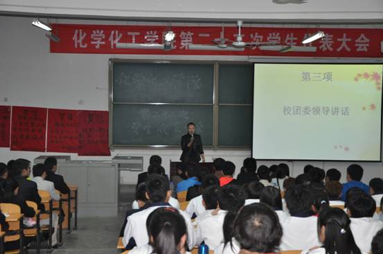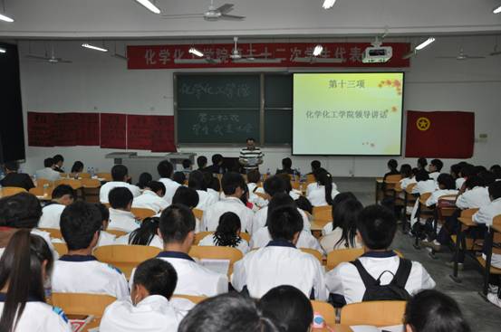 化学化工学院于10月30 日在新校区B214教室顺利召开第二十二次学生代表大会。校团委副书记、新校区分团委书记贾莉娜、校团委办公室主任杜永峰、兄弟院系新校区团学指导老师及学生会代表应邀出席大会,院党总支副书记吴民生、院团委书记董丙剑、辅导员姚军、陈景辉、屈敏佳和院学生代表和共计150人参加了此次会议。