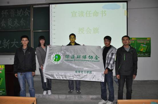 学院新校区团学指导老师陈景辉首先对绿源环保协会宗旨、组织机构、开展的主要活动等相关情况进行了简单介绍,同时宣布了绿源环保协会新一届协会组成人员名单并为本届协会会长团授予会旗。