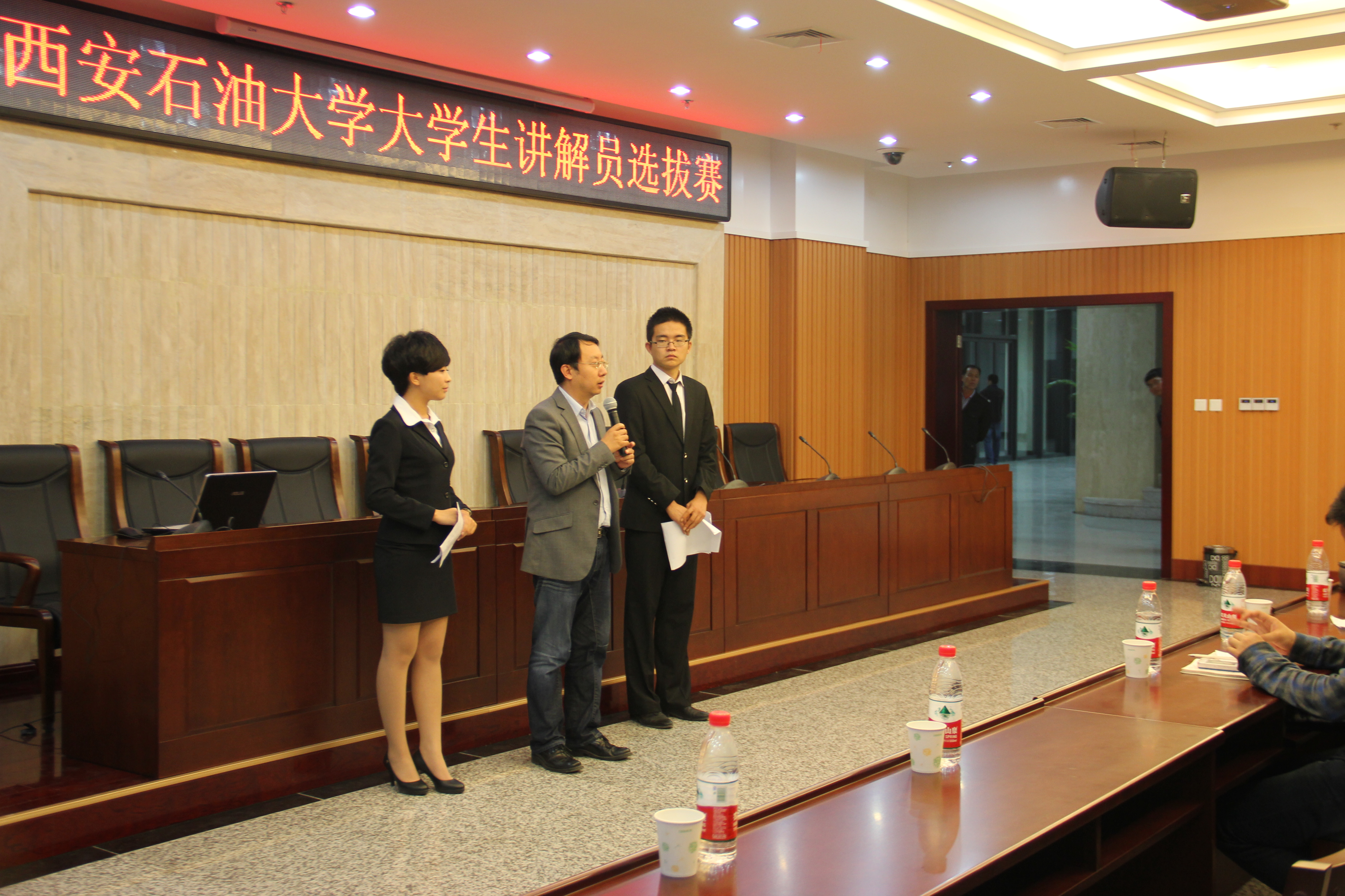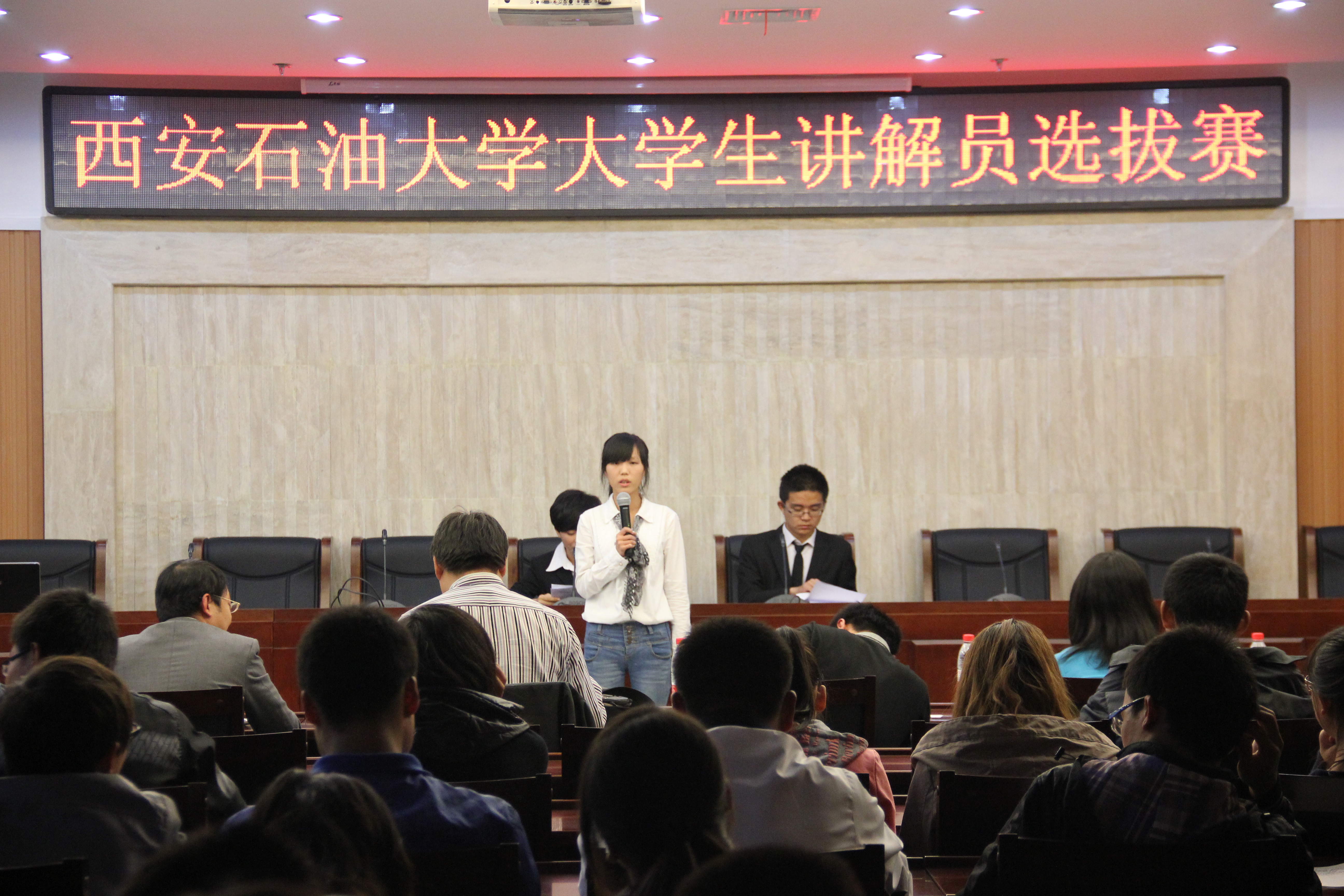 本次比赛共分为两个环节,第一环节为自我介绍,其次为才艺展示。在自我介绍环节中,每位选手有60秒的时间进行自我介绍,形式不限。根据评委打分,最终确定评分较高的5名选手直接晋级,获得实习讲解员资格,评分较低的10名选手被淘汰。其他20名选手为待定选手,在才艺展示环节进行进一步选拔。各位参赛选手都摩拳擦掌向大家展示了自己最精彩的一面,比赛本着公平公正的原则顺利进行着。其中,15号选手丁艺文、16号选手孙嘉阳、21号选手封鑫、22号选手王笑婵、25号选手王一潭、36号选手杨冬在第一环节脱颖而出,直接晋级,获得实习讲解员资格。在才艺展示环节中,7号选手党良颖的英文朗诵、29号选手慎迪的双语新闻播报、34号选手侯震宇的诗朗诵《钓鱼岛的哭泣》均给评委留下了深刻印象,比赛过程紧张而激烈。