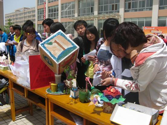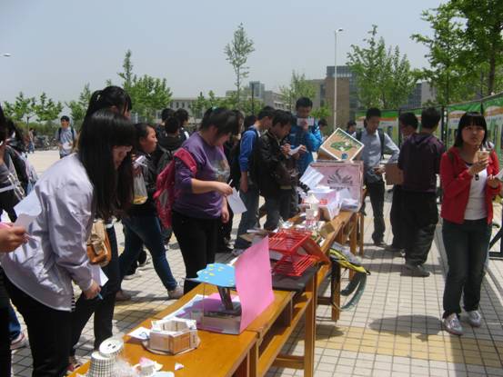 化学化工学院团委、学生会于4月26日中午在新校区东方广场举行了环保创意作品展览。本次参赛作品形式多样,涉及生活用品、工艺品和景观工艺等,特色鲜明的环保创意小作品吸引了不少同学驻足观看,为自己喜欢的作品投上了宝贵的一票。其中世园会吉祥物长安花十分抢眼,吸引了众多过往同学的目光,该作品利用生活中废旧的瓶盖所制作而成,具有很高的欣赏性。
