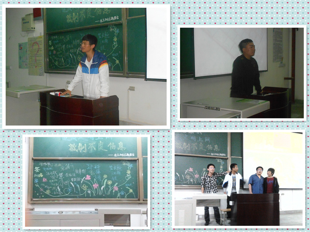 为充分落实学校四月团会精神,引导同学合理利用网络。4月23日晚19时30分,化学化工学院化工1103班在B区202教室成功举办了“增强自律意识,健康文明上网,抵制不良信息”的主题团会。