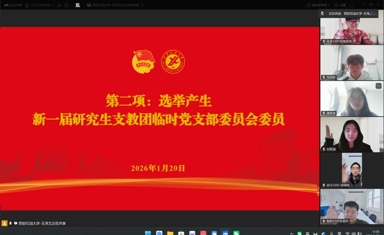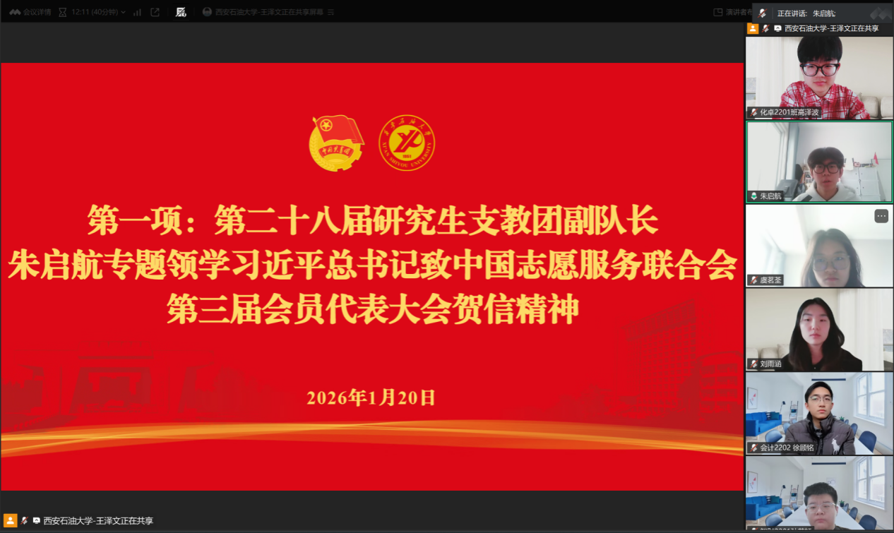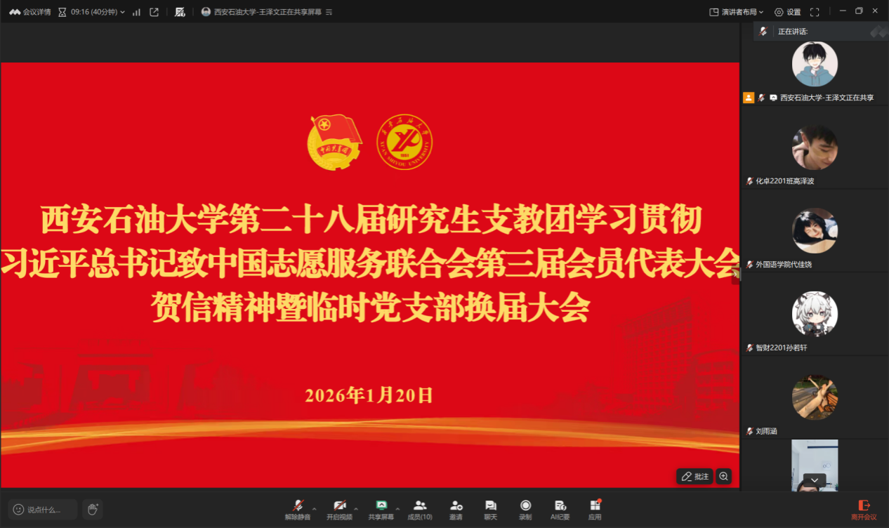 为进一步强化我校研究生支教团党组织建设,凝聚志愿服务青春力量,1月20日,第28届研究生支教团以线上腾讯会议形式召开临时党支部换届大会,校团委书记王刚、我校第28届研究生支教团全体成员参会,会议由校团委组织部干事王泽文主持。
