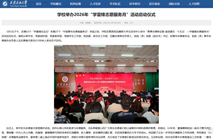 校团委高度重视,结合学校年度工作要点与育人实际,于3月5日印发《关于开展2026年“学雷锋志愿服务月”活动的通知》(西石大团发〔2026〕3号),对全年特别是3月份的学雷锋志愿服务工作进行了系统安排。《通知》明确了“服务重大战略、践行为民宗旨、深入基层治理、融汇学科优势、厚植校园沃土”五大活动方向,为全校活动开展提供了清晰指引。各院(系)团委、各级学生组织迅速响应,结合学科专业特色,制定了具体可行的实施方案,形成了校院联动、分工明确、责任到人的工作格局,确保了各项活动有计划、有步骤地扎实推进。