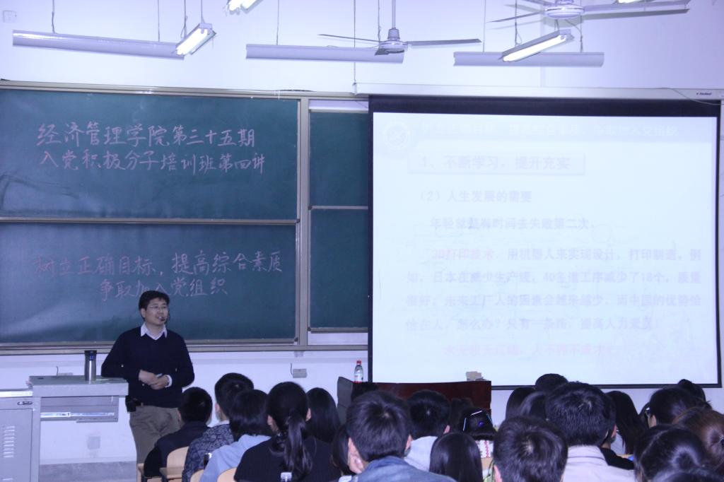 4月9日19:30分,经济管理学院第三十五期入党积极分子培训班第四讲:“树立正确目标、提高综合素质,争取加入党组织”,于新校区B225教室顺利举行。
