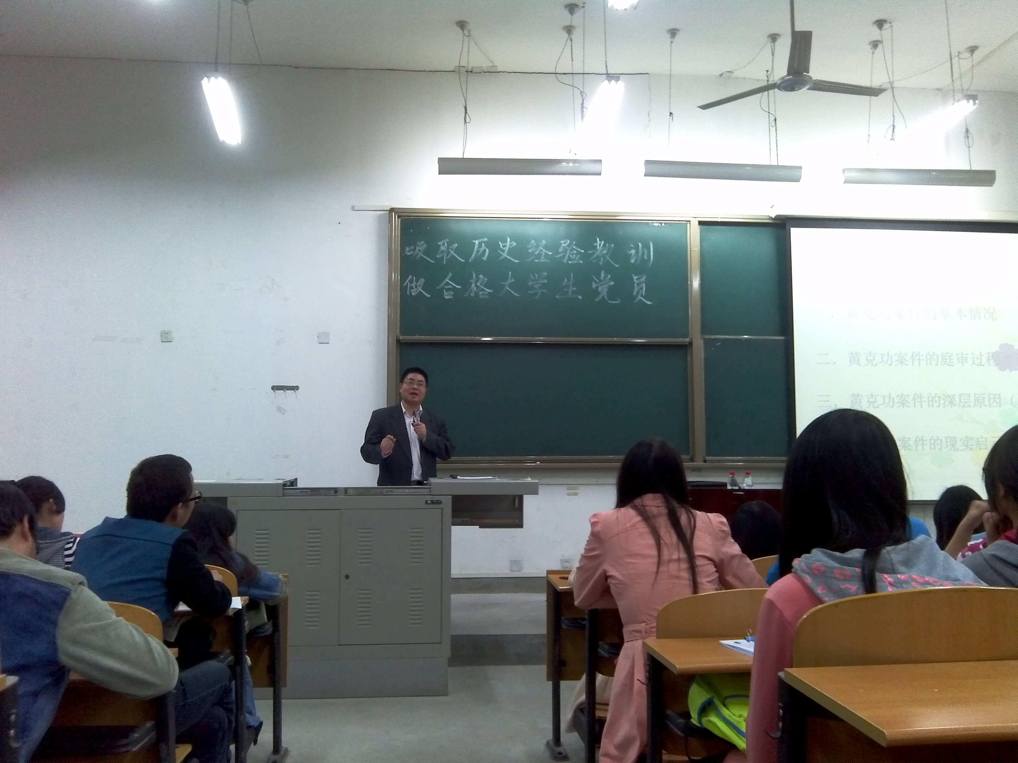余书记以“吸取历史经验教训,做合格大学生党员”为主题,通过对 “黄克功案件”的讲述,引导同学们讨论并总结了黄克功案件的深层原因——居功自傲,特权思想严重,法治思想和观念淡薄,严重落后的封建婚恋观念等原因。余书记要求同学们要增强纪律观念,严格要求自己,不能“以功抵过,以官当罚”,要树立正确的价值观、道德观,并吸取历史教训,争当合格大学生,以实际行动服务社会。