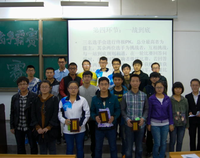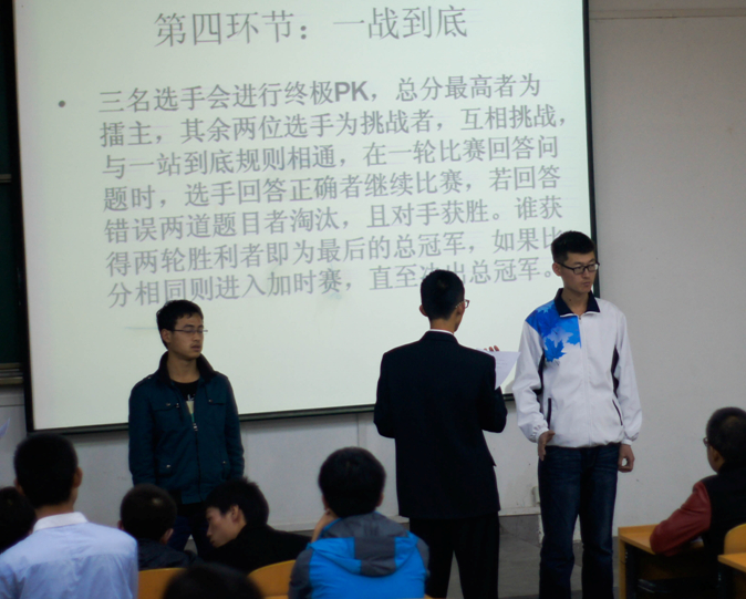 2014年3月31日19:30,由经济管理学院史海扬帆协会主办,经济管理学院团委、校社团管理部和崇文书社承办的第一届“博古通今”历史智者争霸赛决赛在新校区教学B区121教室举行,经济管理学院团委副书记王军、院学生会副主席王怡、史海扬帆协会会长陈元丰、崇文书社社长杨自权出席本次活动。