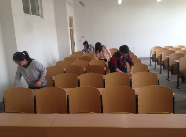此次活动内容主要是对A区各个教室的座椅进行清洁,擦去灰尘和桌上乱画的笔迹。经过大约2个小时的清洁,大部分教室桌椅上遗留的污渍被清除干净。社员们在活动中积极卖力,热情高昂。