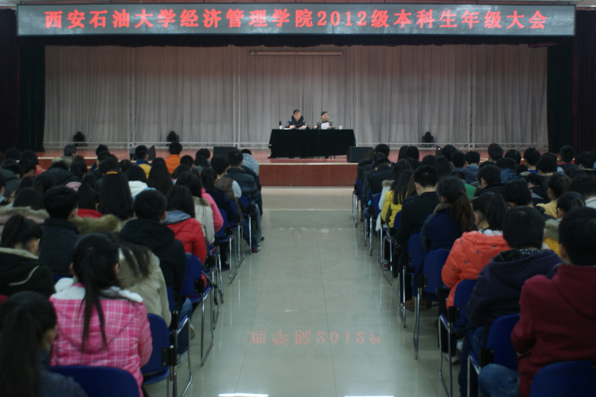 2014年3月6日晚7点,经济管理学院2012级本科生年级大会在腾辉大学生活动中心成功举行。经济管理学院党委副书记蔡强老师、2012级辅导员武威老师出席了本次大会。