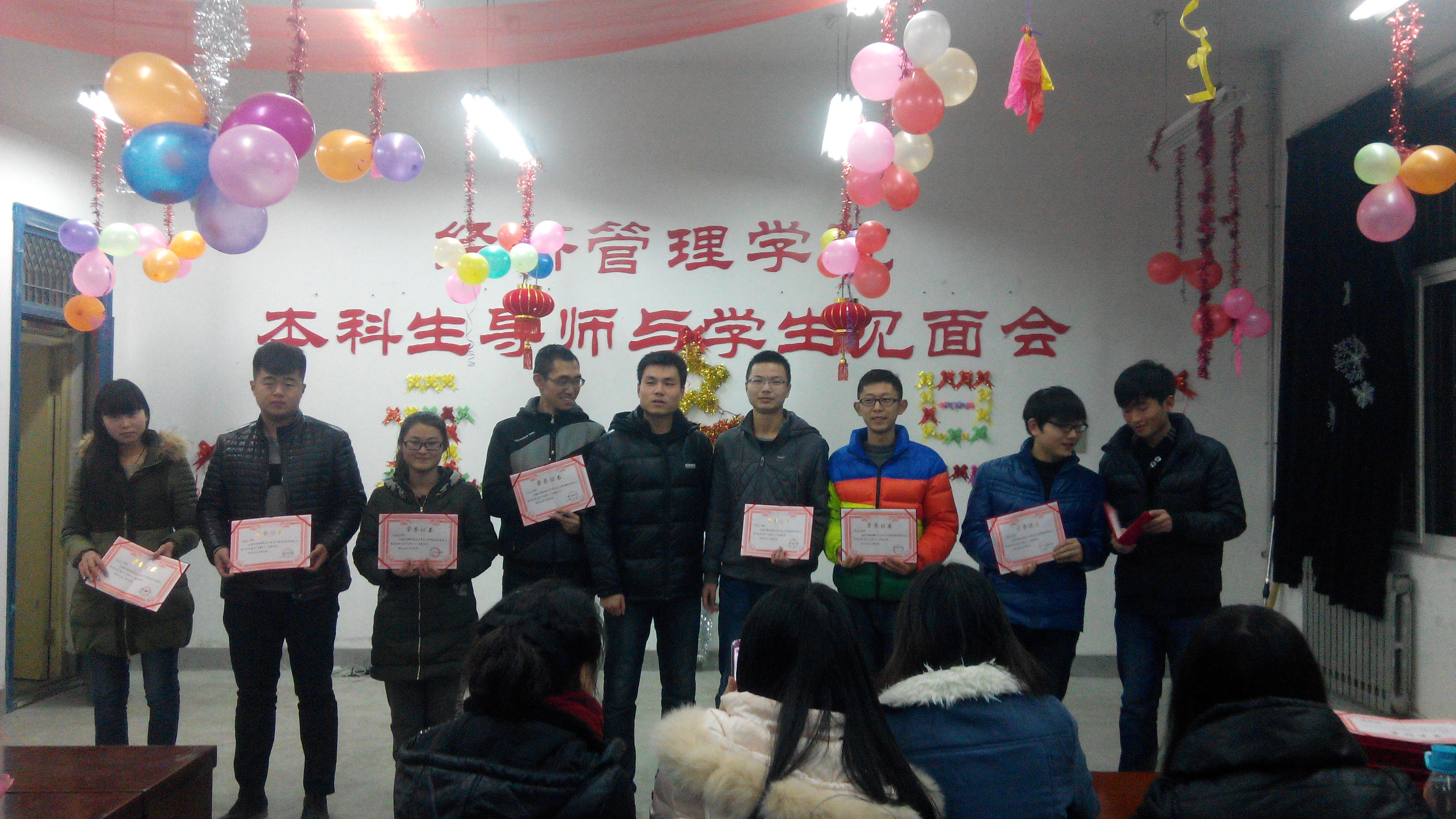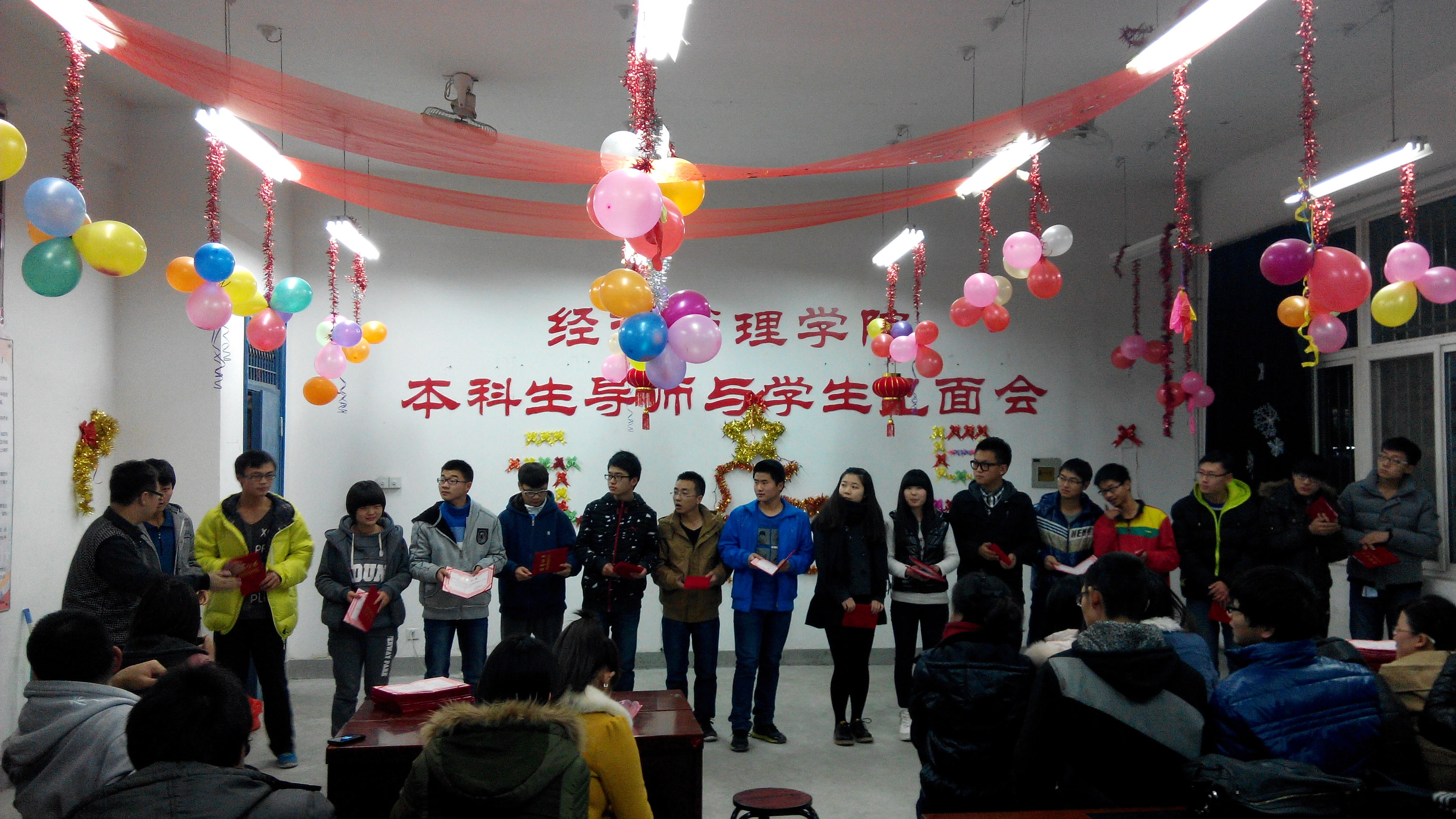 2014年1月2日20:00,经济管理学院在新校区A105会议室举办首届班级新年联欢会闭幕式暨元旦表彰活动,参加本次活动的有经济管理学院辅导员武威老师和樊理君老师、学生会的干部以及2013级的班长们。