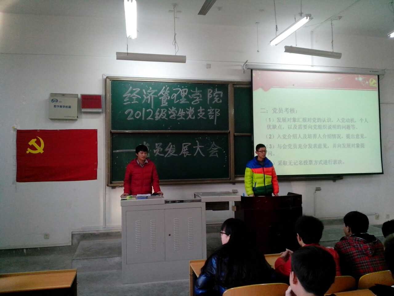 2014年1月2日16:30,经济管理学院2012级学生党支部在新校区B201教室召开党员发展大会,按程序讨论接收预备党员。2012级学生党支部书记武威老师,2012级全体正式党员、预备党员和本次拟发展的六名同志参加了此次会议。