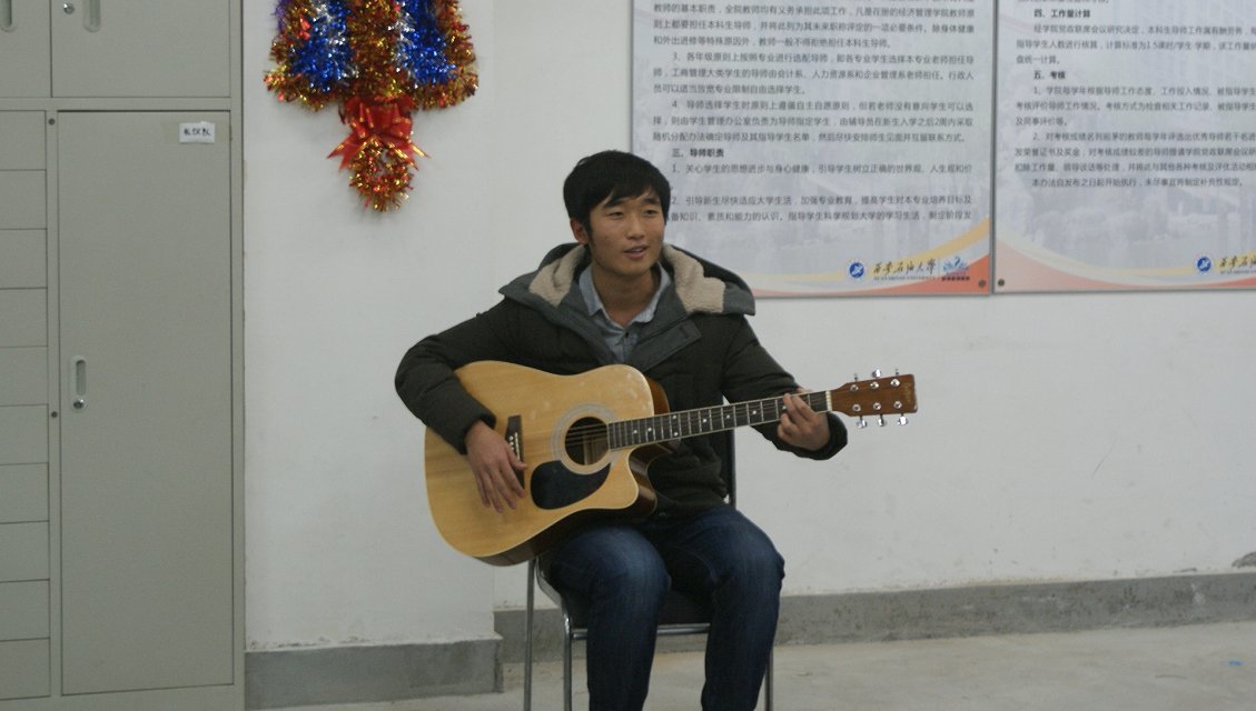 联欢会上,同学们欢聚一堂,热情高涨,掌声笑声喝彩声不断。刘科等同学带来的安塞腰鼓极具地方特色,黄土高原厚重的气息扑面而来。“秋香”刘佳蒙同学献上的吉他弹唱,深情款款,不愧为“经管新声力十佳歌手”。武威老师和付增喻同学表演的《两只老虎》全场爆笑,欢腾一篇。经典的游戏环节《击鼓传花》《真心话大冒险》《萝卜蹲》穿插节目之中,将联欢会推向高潮,极大提高了同学们的积极性。本科生导师程骏老师全程参与其中,或表演节目,或参与游戏,其乐融融。本场班级联欢会结束之际,程老师指出,很开心参与今天的活动,同学们都很棒,祝福大家新年快乐,学业有成。