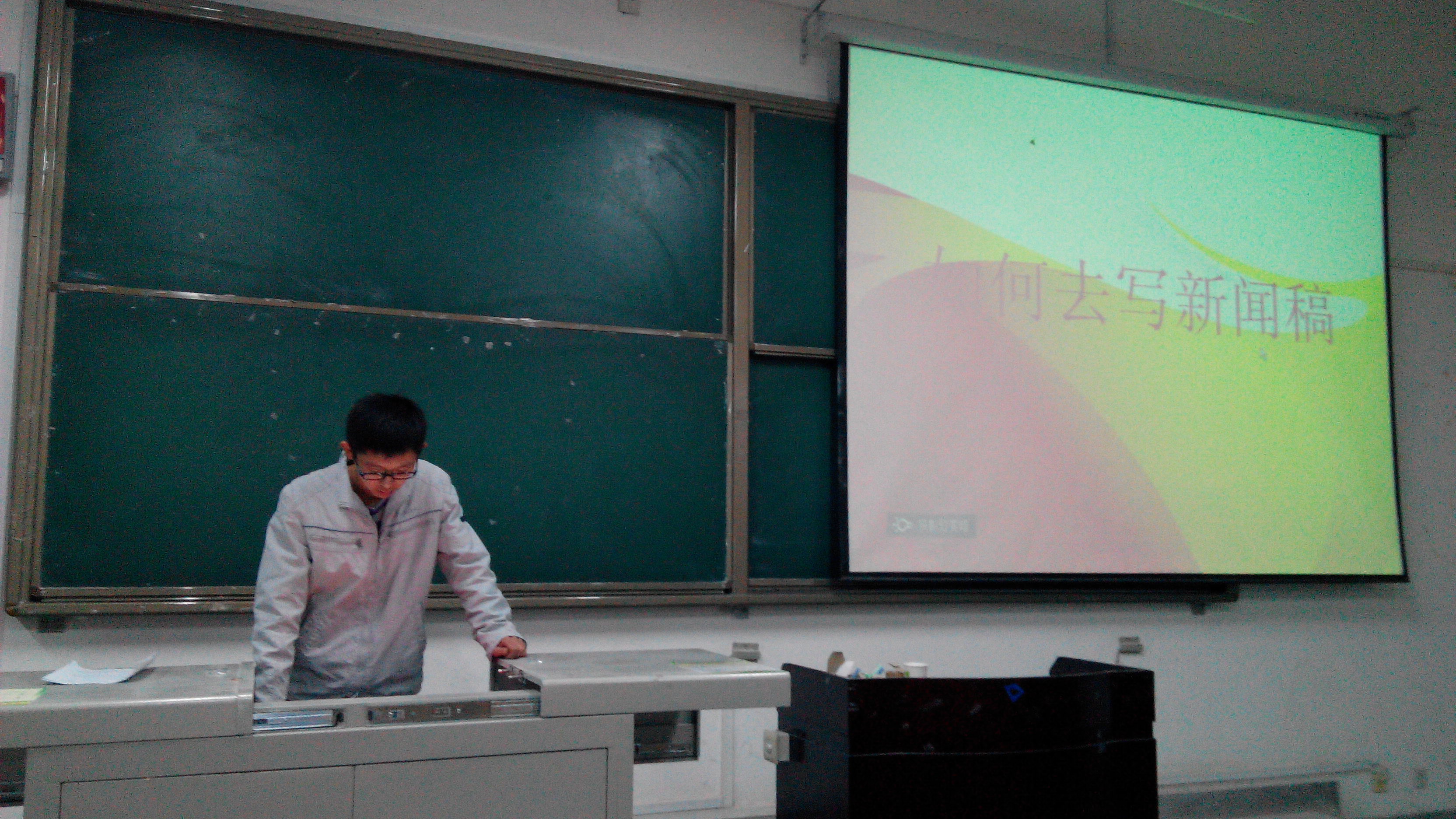 本次培训的主题是“新闻稿的书写”。培训中,周彬部长通过PPT及视频等方式,从“新闻”一词的起源开始,为参加培训的同学详细地介绍了新闻稿的书写要求、书写技巧以及在写作中需要注意的一些问题。