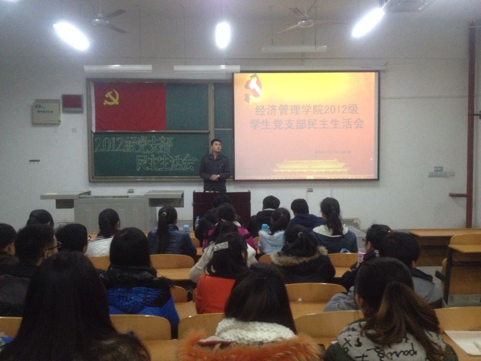 12月5日19点30分,经济管理学院在新校区B区202教室召开2012级学生党支部民主生活会。会议由支部书记武威老师主持,2012级全体正式党员、预备党员和本次拟发展的六名同学参加了此次民主生活会。