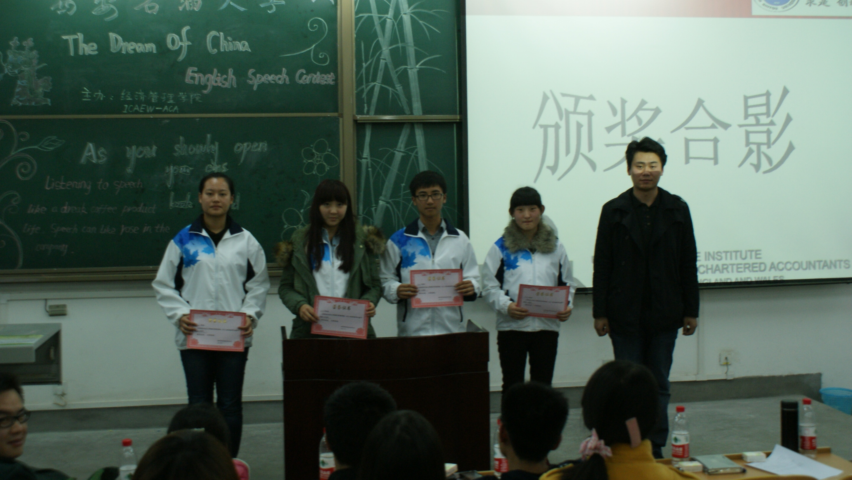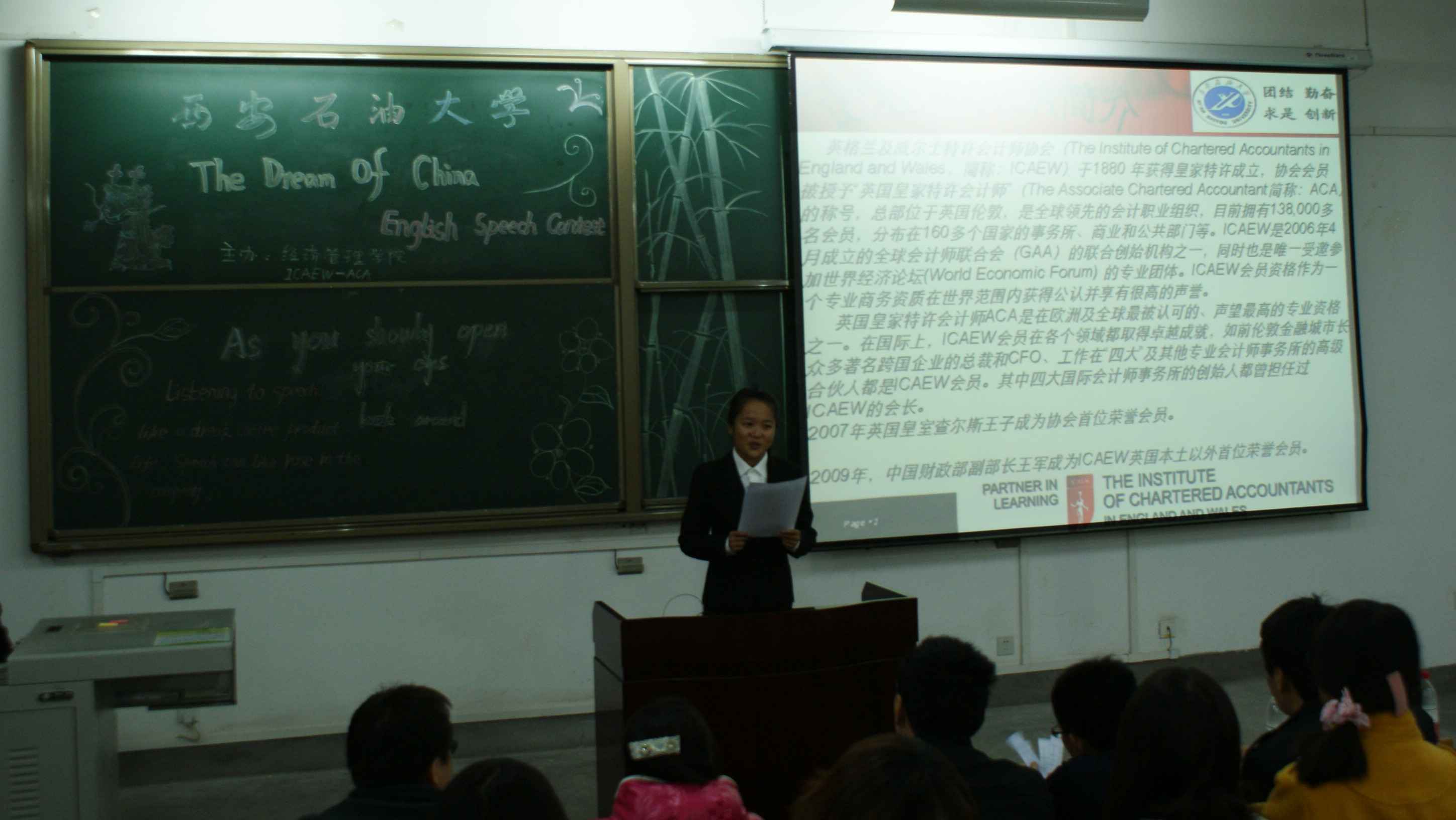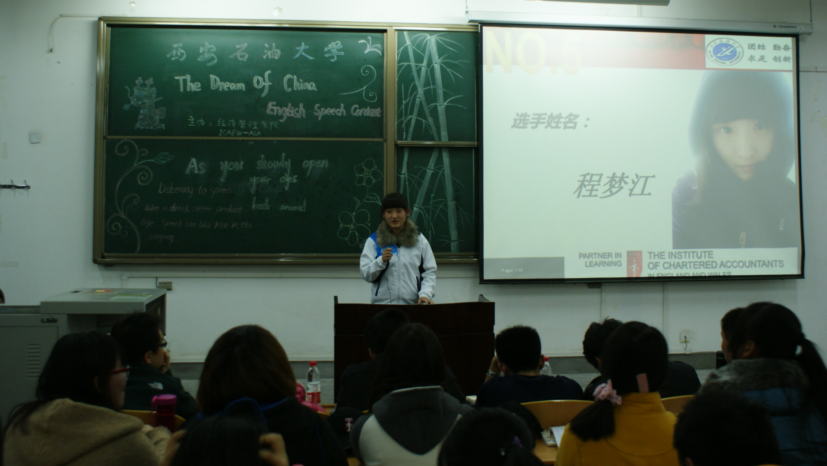 2013年11月27日晚19:30,经济管理学院ACA会计实验班“中国梦,我的梦”英语演讲比赛决赛在新校区教学B区221室举行。本场比赛到场的嘉宾兼评委有经济管理学院武威老师、樊理君老师,石油工程学院张欢老师,地球科学与工程学院郭鹏老师、电子工程学院梁琦老师,以及全国英语竞赛一等奖获得者吴莹同学。